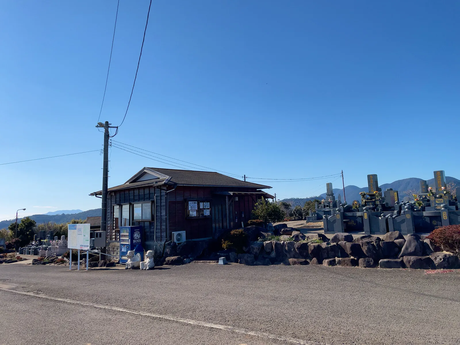 霊園内には、駐車場・休憩所・トイレ・水道・ゴミ箱・自動販売機などを完備しております。